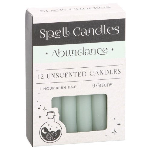 12 pale green spell candles for use with rituals to attract abundance, luck and prosperity. Candle magick is one of the simplest forms of spell casting in which the caster decides on a goal, visualizes the end result and focuses intent or will to manifest that result. Typically the caster will write down their intent on a piece of paper the same colour as the candle, and burn the paper in a fire safe bowl.