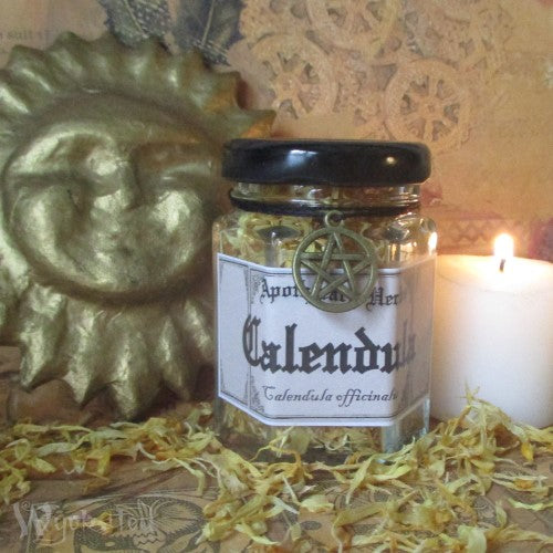 A hexagonal glass jar filled with dried organic Calendula flower petals with a bronze coloured metal Pentacle charm. Ideal addition to any Apothecary for herbal, spell and magick work.