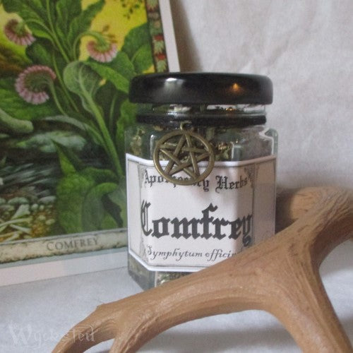 A hexagonal glass jar filled with dried organic Comfrey leaf with a Bronze coloured metal Pentacle charm. Ideal addition to any Apothecary for herbal, spell and magick work.