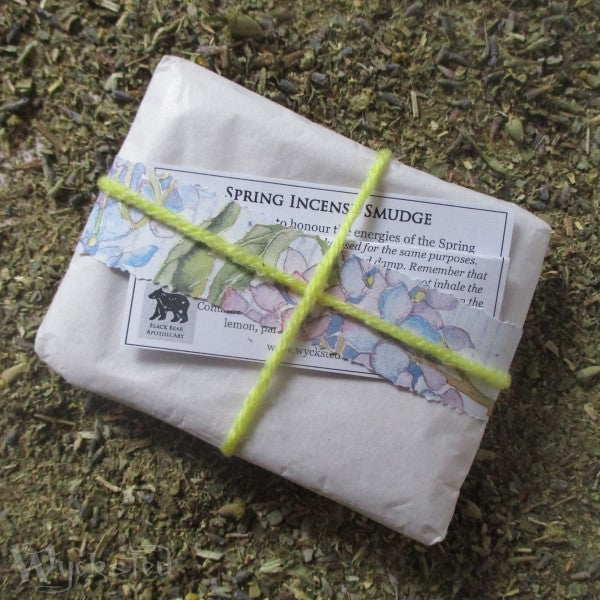 Our incenses, smoke and smudges have been handmade in our Black Bear Apothecary using the finest wildcrafted and organic herbs, resins, barks and spices and we still use our large and rather heavy mortar and pestle for the finer grinds. This blend can be sprinkled onto lit charcoals for smudging or thrown into the Spring balefire and the smoke used for the same purposes.